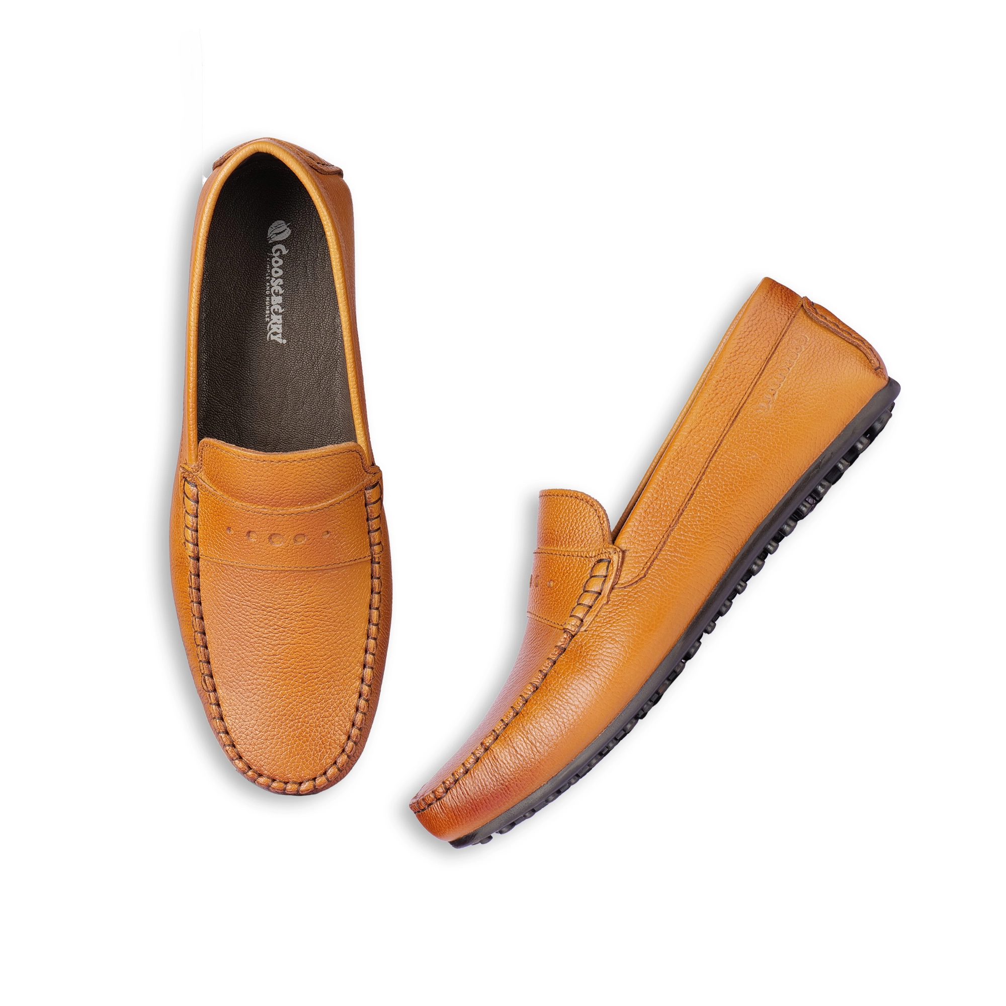 The Gooseberry G9666 Natural leather loafer for men — natural pebble grain leather, hand-stitched moccasin toe, rubber driving sole. Tan, Brown & Black. Sizes 6–10. At ₹2,899 — the smartest slip-on in your wardrobe.
